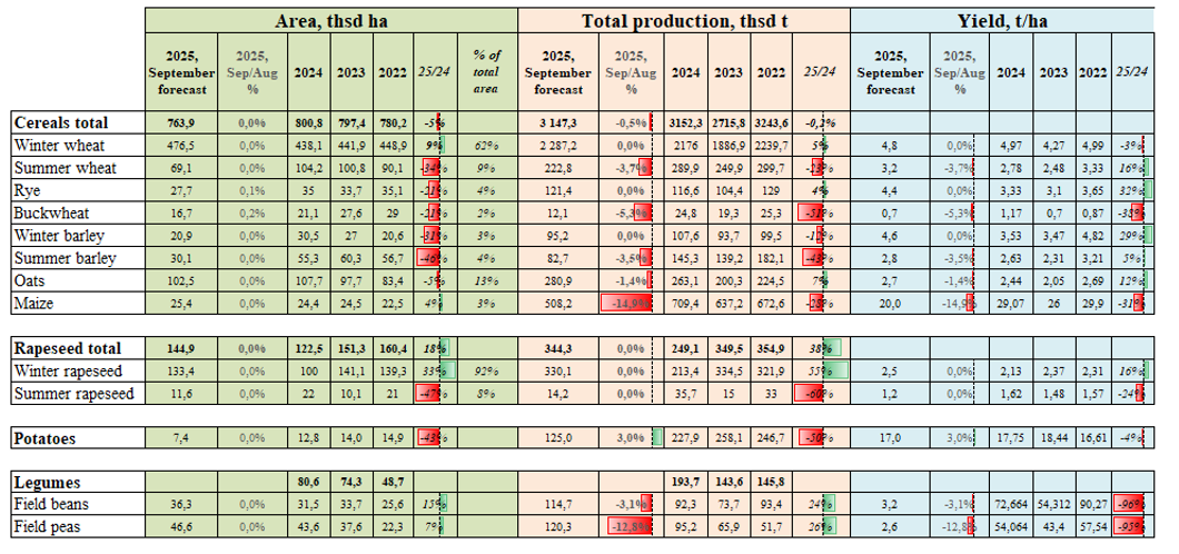 The crop yield forecast for cereals, rapeseed, potatoes, field beans, peas and maize carried out by specialists of the Latvian Rural Advisory and Training Centre on 23 September 2025 shows that the total production for almost all summer crops have decreased compared to the August forecast: maize (-14.9%), buckwheat (-5.3%), summer wheat (-3.7%), summer barley (-3.5%) and oats (-1.4%). The total production of field beans and field peas also decreased by -3.1% and -12.8% respectively.