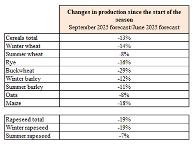 Buckwheat, winter rape, maize and rye are among the most severely affected by adverse agro-climatic conditions. Total wheat production is also decreasing for both winter and summer crops: winter wheat -14%, summer wheat -8%.