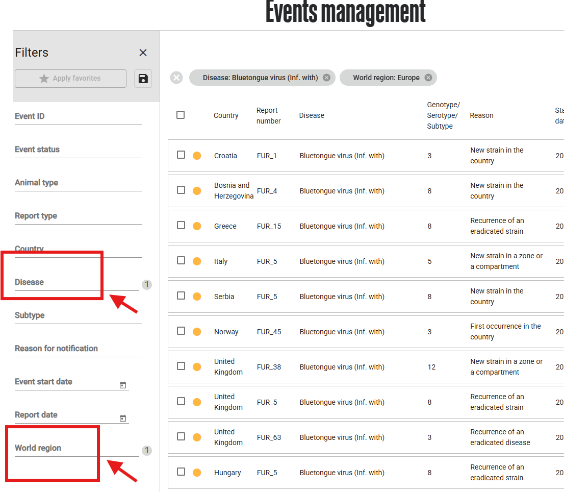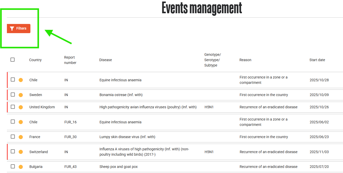 - noklikšķinot vai piespiežot uz saites https://wahis.woah.org/#/event-management, var izmantot filtrus un atlasīt konkrētu slimību, valsti, datumu.
