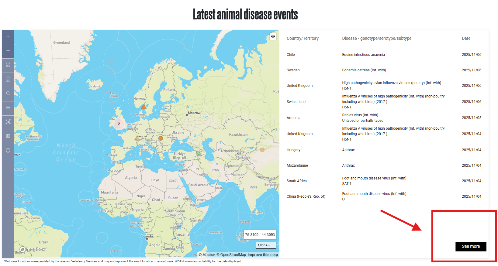 - redzama karte ar pēdējā laika slimību uzliesmojumiem. Kartē noklikšķinot vai piespiežot uz konkrētiem notikumu vai uzliesmojumu punktiem, var iegūt papildu informāciju par slimību, vietu, datumu, dzīvnieku sugu utt.