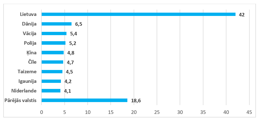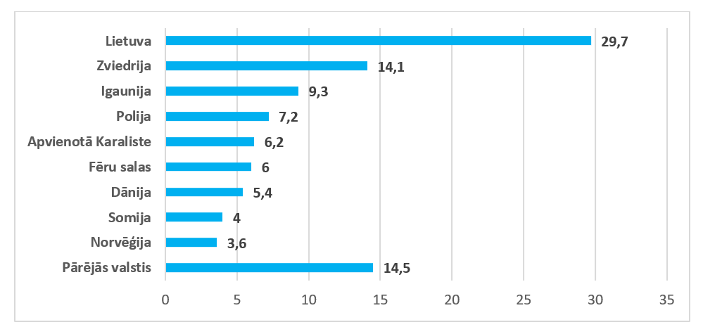 Trešo valstu īpatsvars 2024. gadā veidoja 23,3 % no Latvijas kopējā sagatavoto vai konservēto zivju un jūras produktu importa apjoma, un salīdzinājumā ar 2023. gadu palielinājās par 5,3 procentpunktiem.