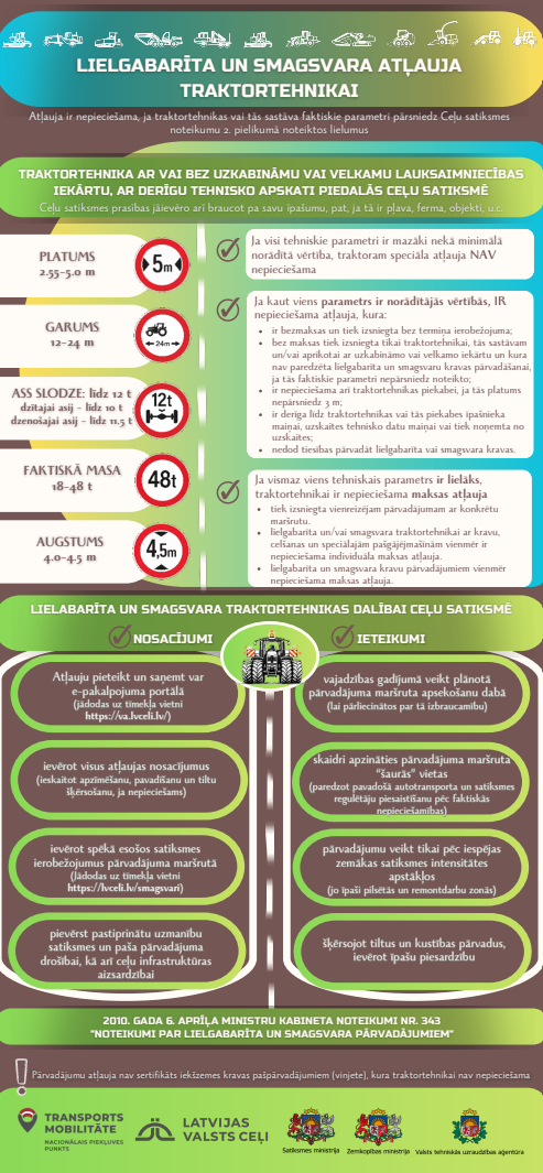 Atļauja ir nepieciešama traktortehnikai ar vai bez uzkabināmu vai velkamu lauksaimniecības iekārtu (bez kravas), ar derīgu tehnisko apskati, kas piedalās ceļu satiksmē, ja tās faktiskie parametri pārsniedz Ceļu satiksmes noteikumu 2. pielikumā noteiktos lielumus.