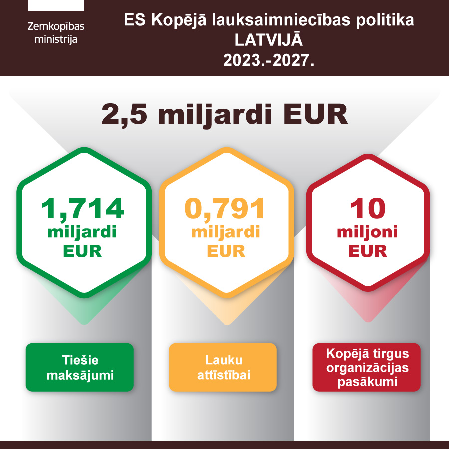 Kopumā turpmākajos piecos gados saskaņā ar KLP SP Latvijas lauksaimnieku atbalstam paredzēti 2,5 miljardi eiro. Lielākā daļa no šī atbalsta jeb 1,714 miljardi eiro tiks piešķirti tiešo maksājumu veidā. Savukārt lauku attīstības pasākumiem paredzēts 0,791 miljards eiro.