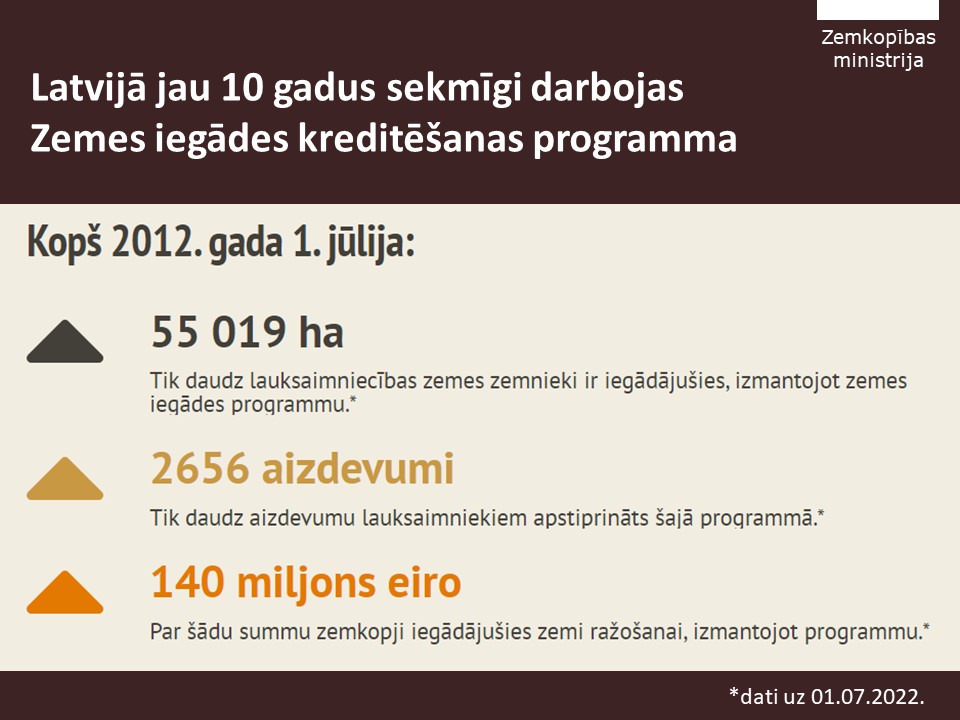 “Zemes iegādes kreditēšanas programma jau desmit gadus sniedz iespēju jaunajiem lauksaimniekiem, kā arī mazām un vidējām saimniecībām Latvijā attīstīt savu lauksaimniecisko darbību. Šī programma nodrošina, ka saglabājam Latvijas zemes resursu mūsu lauksaimniekiem, sekmējam jaunu darba vietu veidošanu reģionos un Latvijas lauku attīstību,” atzīmē zemkopības ministrs Kaspars Gerhards.