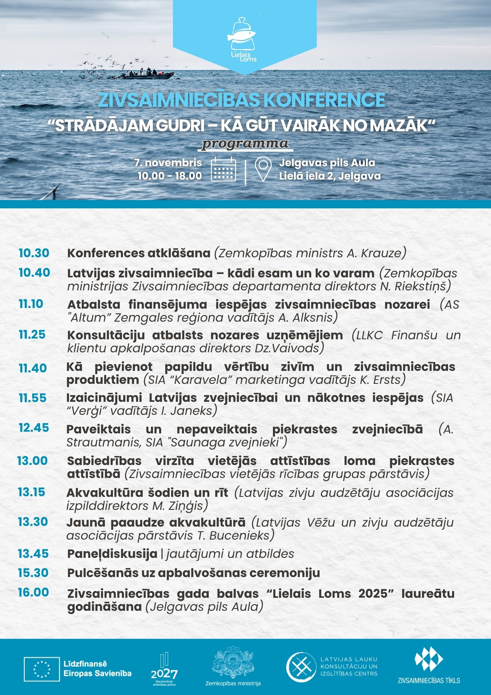 Zemkopības ministrs Armands Krauze piedalīsies zivsaimniecības konferencē un uzrunās zivsaimniekus, kā arī tiksies ar nozares ekspertiem un uzņēmējiem. Konferencē runās par situāciju nozarē, atbalsta iespējām, papildu vērtības radīšanu zivīm un zivsaimniecības produktiem, piekrastes zvejniecību un akvakultūras attīstību