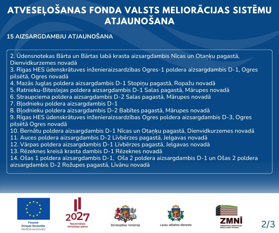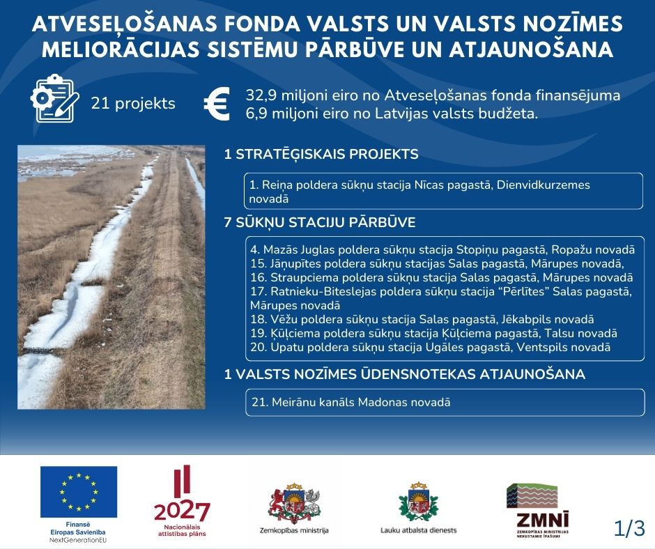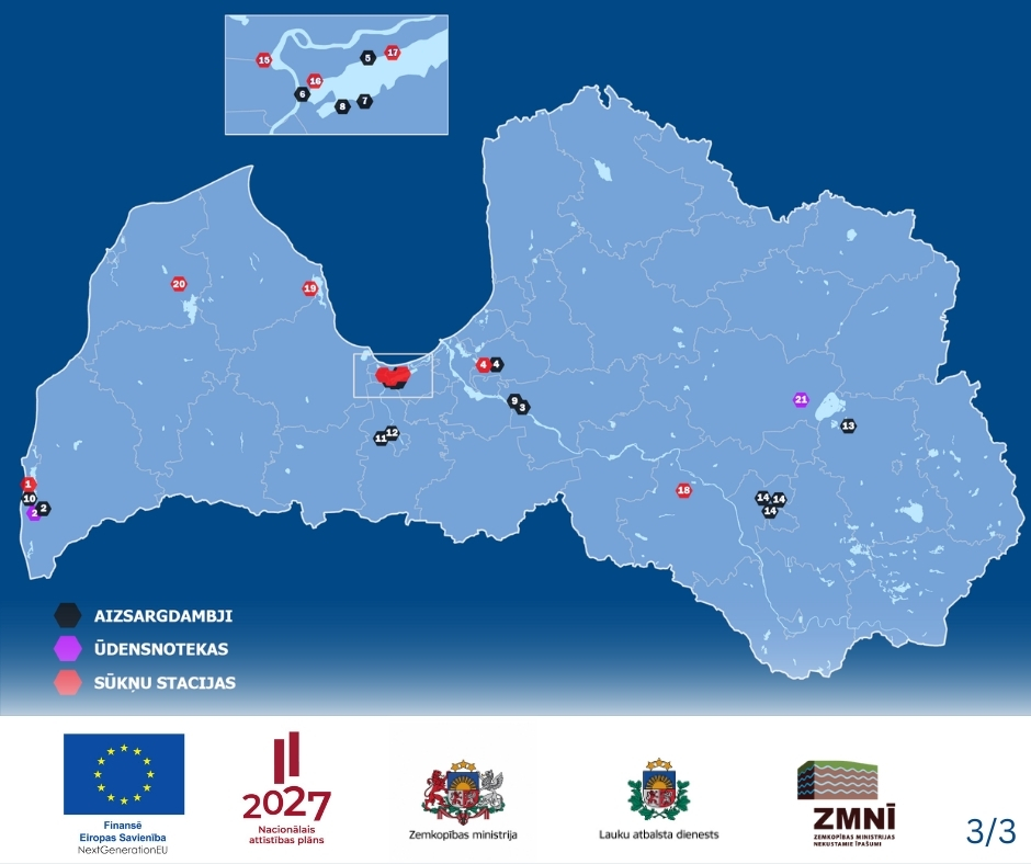 - Viens no pasākumiem plūdu risku mazināšanai ir valsts meliorācijas sistēmas Reiņa poldera sūkņu stacijas Nīcas pagastā, Dienvidkurzemes novadā, pārbūve