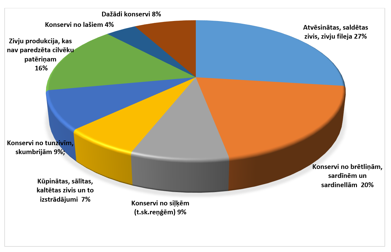 Savukārt zivju produkcijas realizētais apjoms, kas nav paredzēts cilvēku patēriņam, sastādīja 14,4 tūkst. tonnas 18,8 milj. eiro vērtībā, kas liecina par dažādu zivju blakusproduktu un zemākas kvalitātes zivju izejvielu pilnvērtīgu pārstrādi.